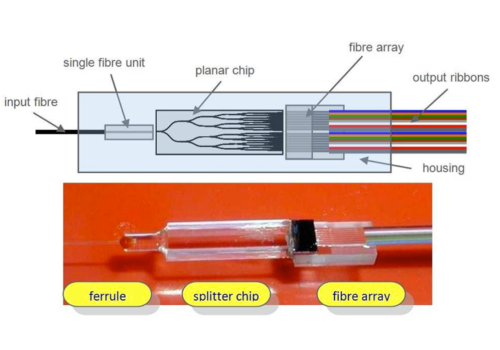 Este componente divide la señal óptica a nivel de potencia en el número de caminos que necesitemos. Este dispositivo es 100% pasivo, plano, de silicio, es como un árbol con un número de ramas por donde la potencia óptica será encaminada de manera controlada. Su aplicación está directamente relacionado con las redes PON o FFTX.